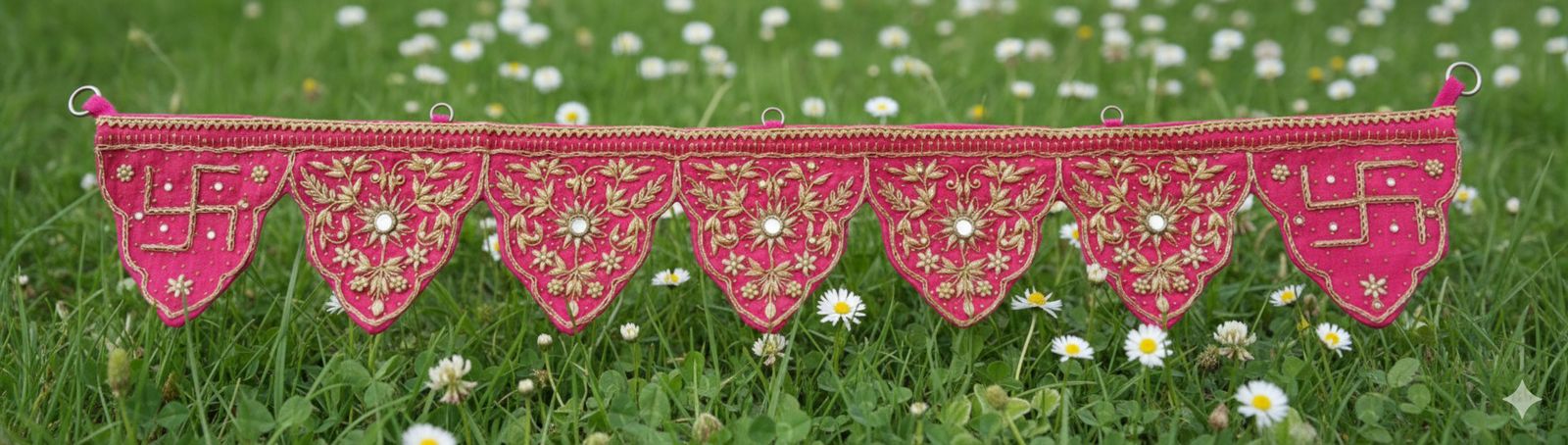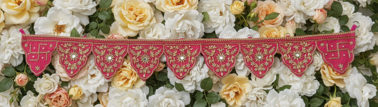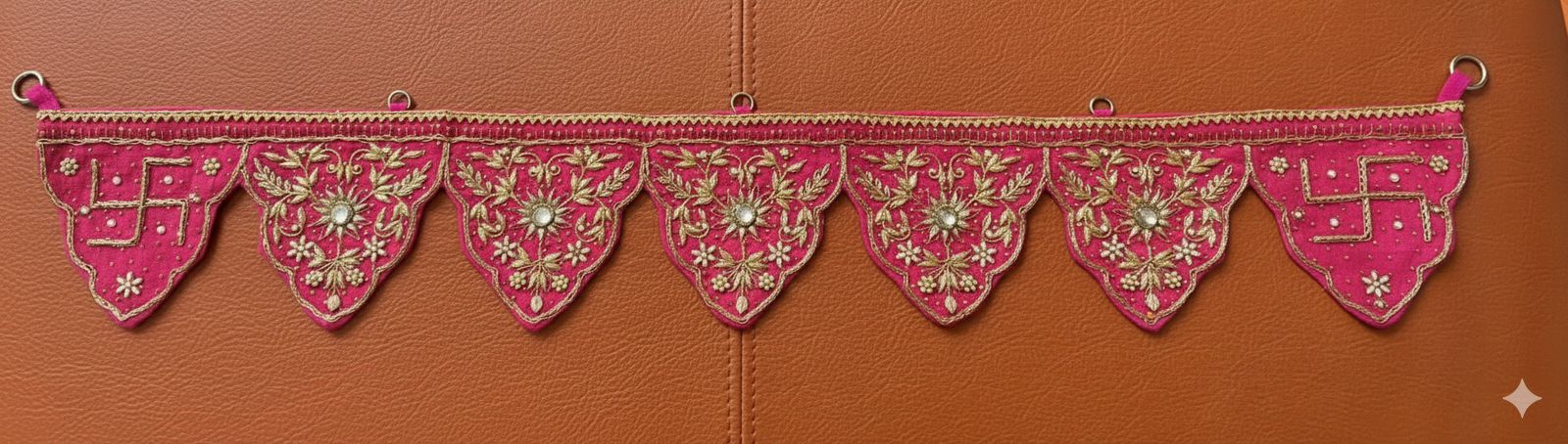 The Gul Pravesh Bandhanwar blooms like the first light over rose petals, vivid and full of quiet joy. Handcrafted on rich fuchsia, each scalloped pennant carries detailed gold zari embroidery and tiny mirror highlights that glimmer gently with the flicker of a diya.