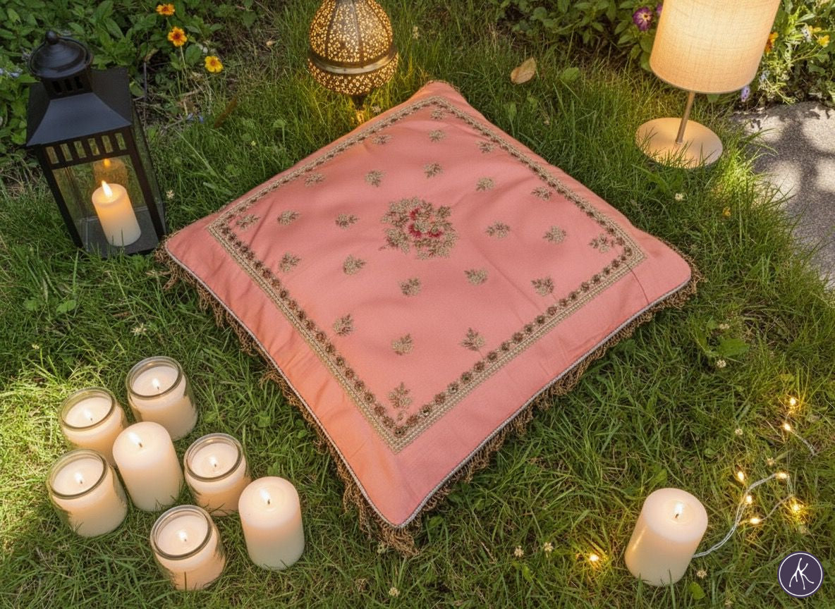This gaddi carries the grace of Mughal gardens, where flowers were carefully arranged in symmetry and fountains mirrored the sky. Its presence in a setting — whether beneath a canopy of stars in an open courtyard or within an intimate drawing room — creates a sense of poetic romance and timeless refinement.
