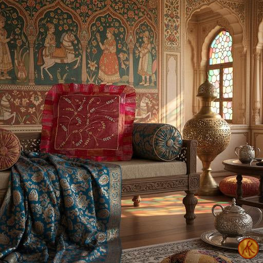 The Gulnar Crimson: Gaddi is born of velvet woven on traditional looms, chosen for its depth of color and the way it catches light at every angle. Onto this canvas, artisans lay golden threads by hand, tracing vine motifs that mirror the murals of Rajasthan’s palaces. Each stem and leaf is embroidered using hours of meticulous chain-stitch and zardozi techniques, often requiring multiple craftspeople working in sequence to maintain symmetry.