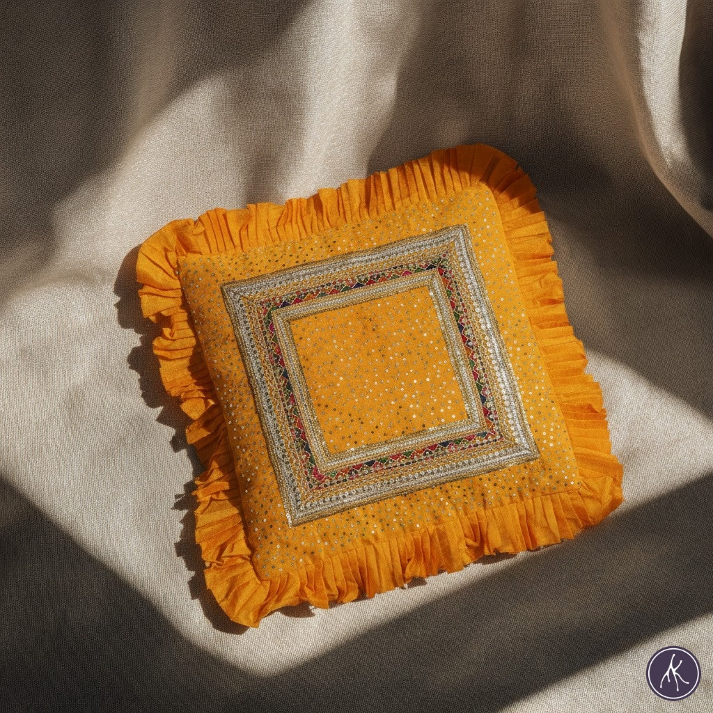 The Kanaka Prabha: Gaddi glows in a marigold yellow silk base, speckled with hand-applied golden dots that shimmer like scattered diya flames. At its heart lies a square medallion embroidered in zari, bordered with fine resham in red and green accents. This layered frame is built stitch by stitch, combining metallic threadwork with geometric rhythm so the square radiates depth and strength. Around the edges, artisans have hand-pleated silk into soft ruffles, a finishing technique that requires precision to maintain both volume and symmetry.