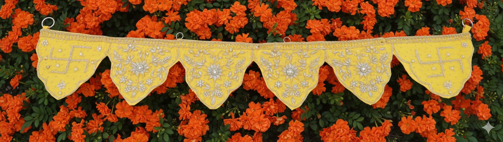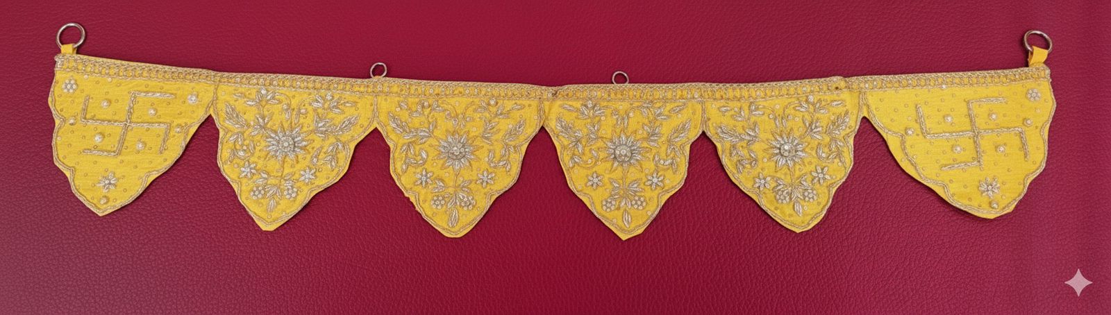 The Kesar Pravesh Bandhanwar glows with the warmth of sunrise, its golden hue carrying the promise of light and purity. Each pennant is hand-embroidered in fine silver zari, tracing floral patterns that shimmer softly as they catch the day’s first rays. The sacred swastikas at either end hold within them the blessings of harmony, prosperity, and peace.