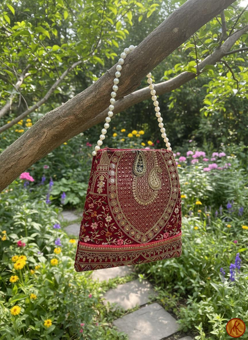 The Noor Mahal: Potli is fashioned from handwoven velvet in a regal shade of deep maroon, adorned with zardozi embroidery that takes weeks of patient work. Metallic threads are coaxed into intricate paisley and floral motifs, each stitch demanding precision so the patterns remain symmetrical across the curved surface. Tiny sequins and beads are added one by one, giving the embroidery its jeweled glow.