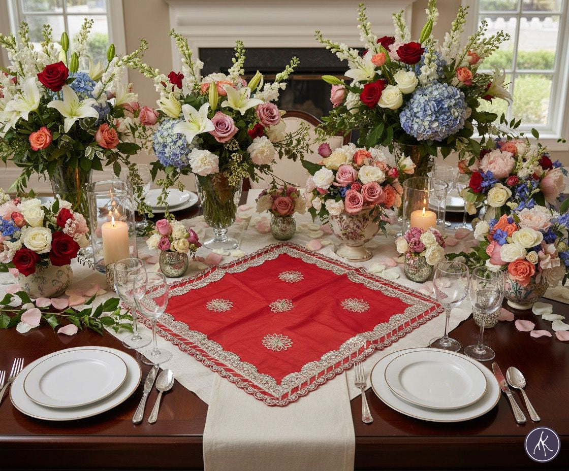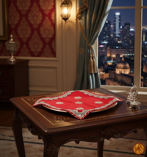 The Ratnapriya Bloom: Thaalposh is crafted in silk of vivid vermilion, embroidered with silver-thread blossoms arranged in perfect harmony. Each flower is stitched with meticulous precision, built petal by petal so the surface shimmers with quiet elegance. The border is edged with scalloped zari, finished by hand to frame the center motifs with a regal outline.