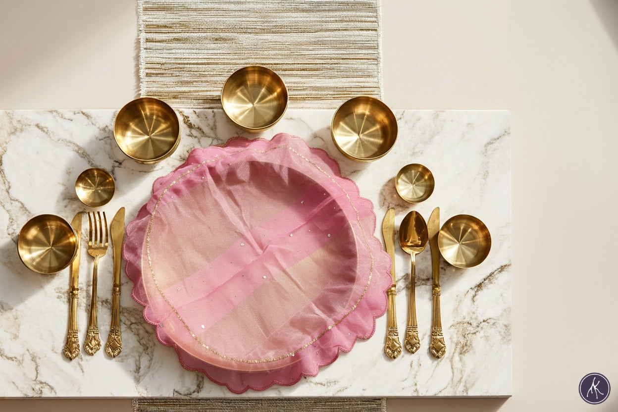 The Rosé Dawn: Thaalposh is crafted from sheer organza, hand-dyed to capture the delicate gradient of early morning skies over Rajasthan. Each cover is edged with scalloped embroidery, stitched patiently with metallic threads that catch the light like a soft halo. Scattered across its surface are tiny sequins, each sewn by hand to add quiet sparkle without overpowering the fabric’s translucence.