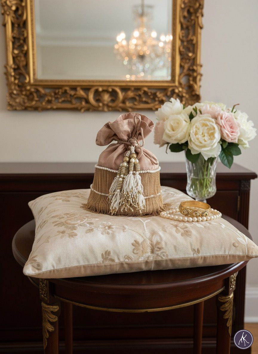 The drawstring is secured with pearl embellishments, transforming a functional closure into an ornament of its own. This potli is inspired by the understated opulence of royal boudoirs, where muted tones and pearls spoke louder than gilded excess. Whether paired with a bridal lehenga or an evening gown, it elevates essentials into heirloom-worthy adornment — a vessel of quiet luxury designed for modern sophistication.