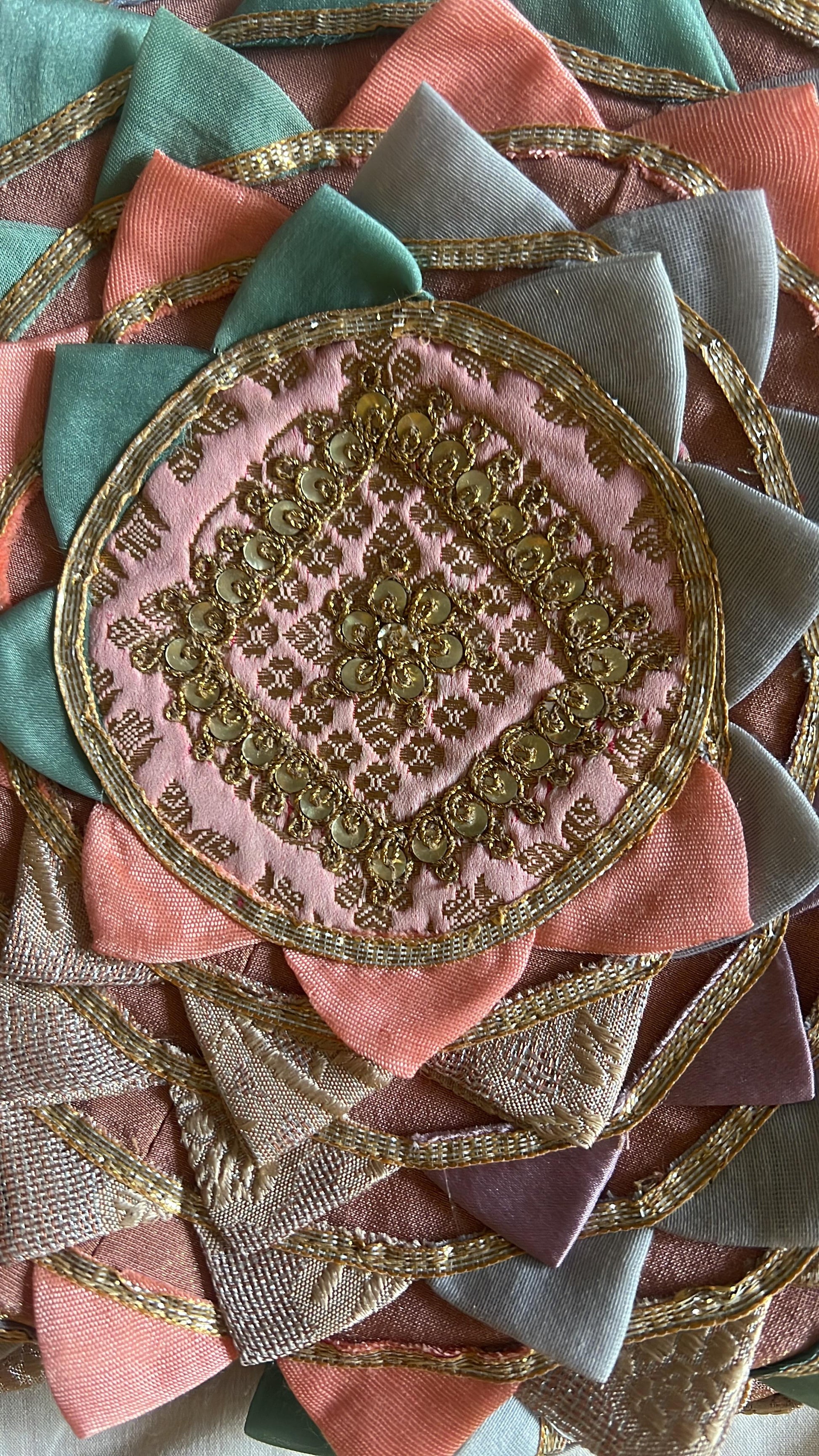 The Satrangi Bloom: Thaalposh unfolds like a blossoming flower, each petal formed from folded silk in pastel shades of rose, aqua, and lavender. Every layer is stitched by hand, carefully aligned so that the concentric rings rise like a lotus in bloom. The silk itself comes from Banaras, woven with silver zari that glimmers faintly against candlelight, while the folded-petal technique is perfected by artisans who spend days assembling each thaalposh into its sculptural form.