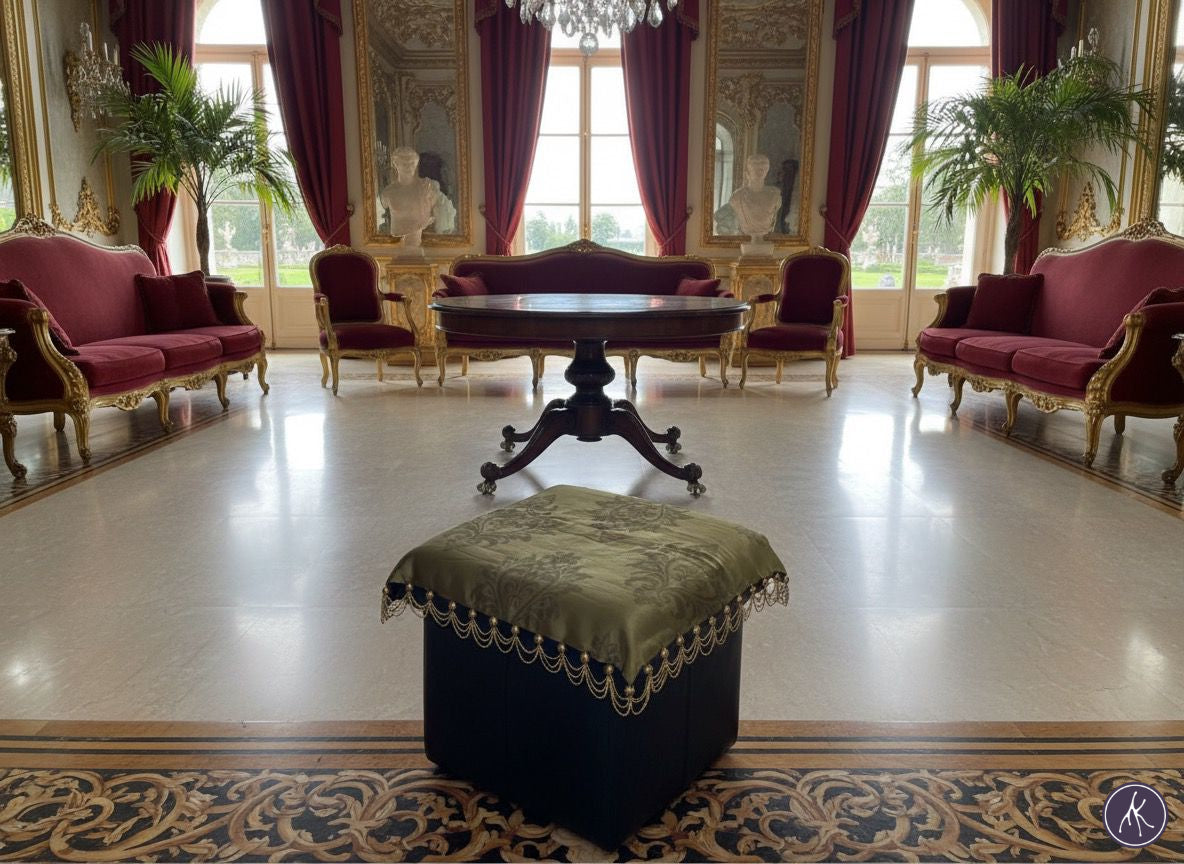 Historically, such gaddis were not mere seats but markers of rank, placed in darbars where hierarchy was signaled through textiles as much as jewels. This piece carries that same aura, transforming any setting into one of quiet authority. Whether placed in an ornate salon or part of a modern interior with classical accents, it bridges past and present through a textile language of dignity and grandeur.