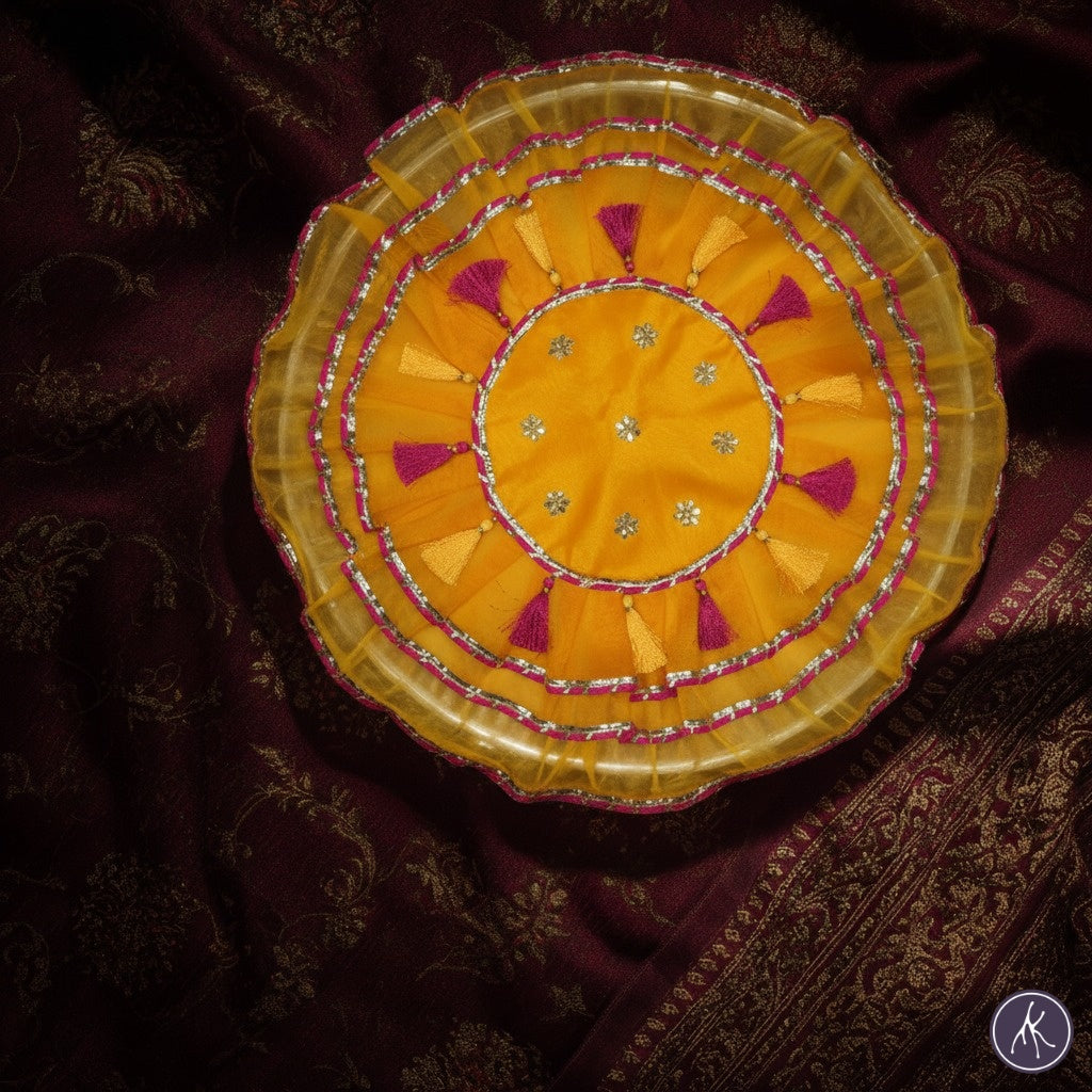 The Surya Pushp: Thaalposh radiates the brilliance of a rising sun. Hand-sewn in luminous yellow organza, it is framed with ruffled tiers edged in pink and silver thread, stitched carefully to create depth and movement. Around the central circle, artisans have embroidered golden blossoms with resham and zari, while bright tassels in magenta and saffron are anchored at intervals, echoing temple garlands and festive buntings. Each tassel is hand-twisted and bound, requiring hours of delicate work before it is secured to the fabric.